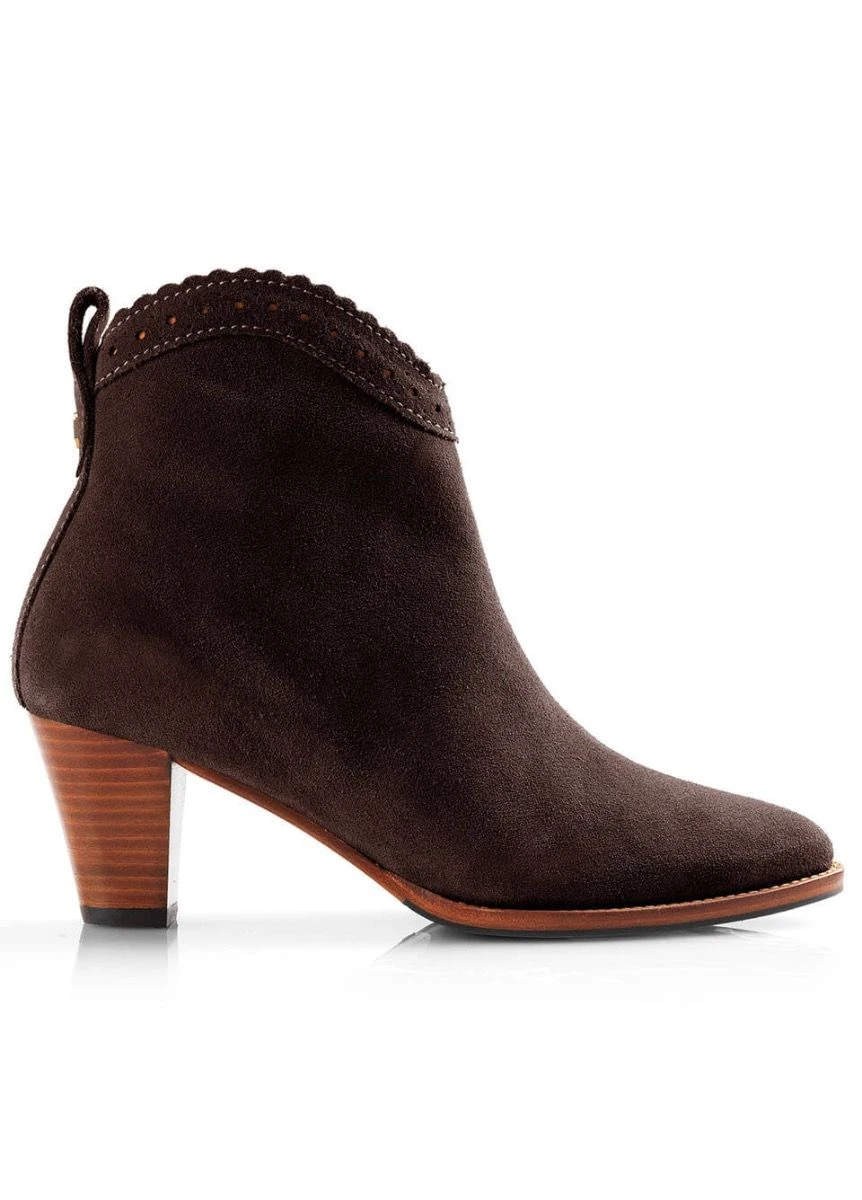 Taking some of the most distinguishable elements of our definitive tall boot, the Regina Ankle draws from our timeless piece, whilst retaining individuality. This Ankle boot is, in comparison, designed with a more elegant arched block heel and pointed toe, yet retains the wooden /rubber sole and scalloped design edging. With signature shield detailing on the rear pinch tab, the Regina Ankle can be slipped on easily – finishing an outfit, whilst drawing on the classic features of our iconic knee-high boot.