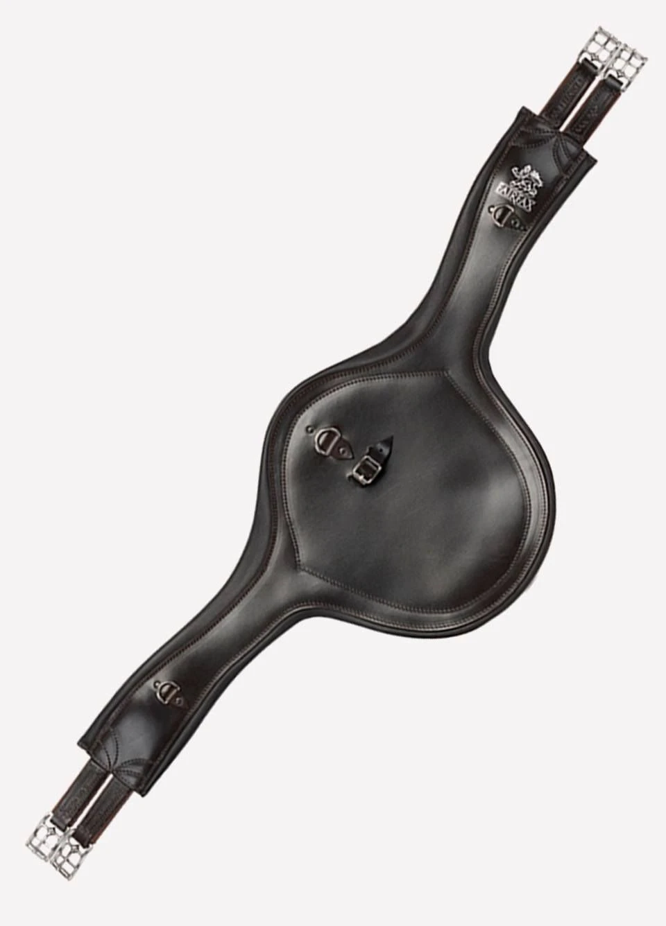 How to fit your Fairfax girth – Place the curved section facing forward between the horses front legs with the Fairfax Logo featuring on the near side