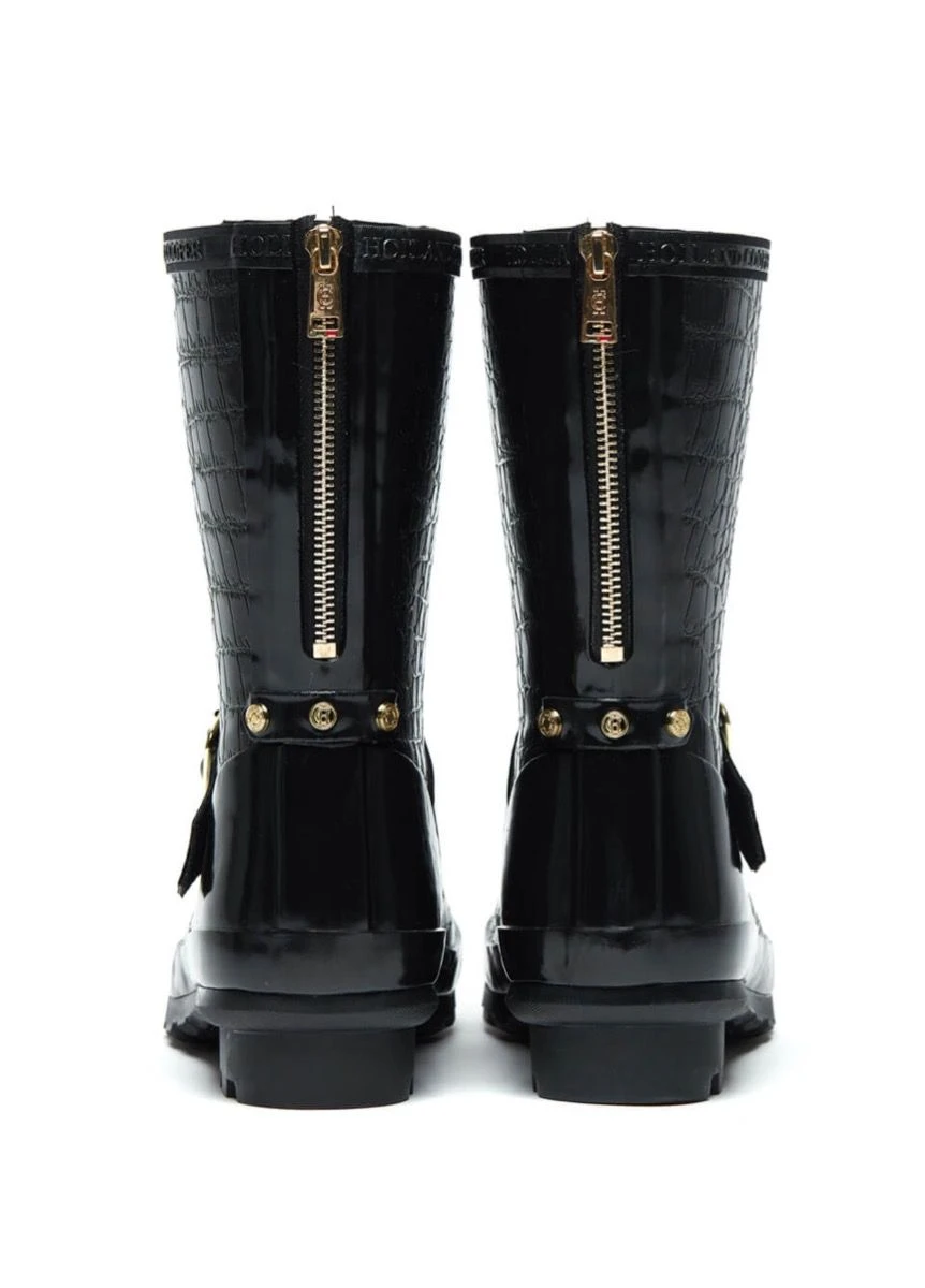 Handcrafted from a superior vulcanised rubber, our Short Zip Chelsea Wellington Boots are 100% waterproof – perfect for keeping your feet dry and stylish this spring. The cropped boot features a traction grip sole that provides stability on all terrains, whilst the quick dry fabric adds to both their luxury look and practicality. This eye-catching boot is adorned with iconic HC hardware, strapping details and a gold zip running down the back of wellington.