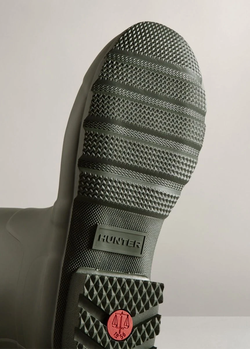 Designed to shield and protect from the elements, the Original Tall Wellington Boot has been at the heart of the Hunter Original brand since its introduction in 1956. Formed of natural rubber, each pair is made from 28 hand-cut parts and assembled over three days on an aluminium last bespoke to Hunter, before being vulcanised for superior protection. Featuring the Hunter Original tread pattern, and a comfortable polyester lining, this men’s waterproof boot with a dark green matte finish is a wet weather necessity.