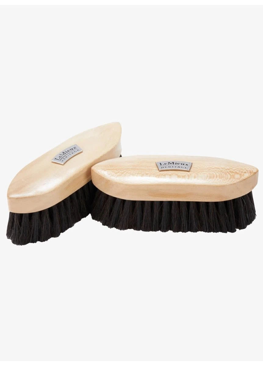 Fantastic combination brush of soft horse hair & synthetic bristle, brilliant everyday brush. Great for sensitive horses and dirty heads & legs. Ideal when you’re short of time. Complete with a solid grained wooden handle grooved on the outside for ease of grip and beautiful solid metal LeMieux Heritage badge.