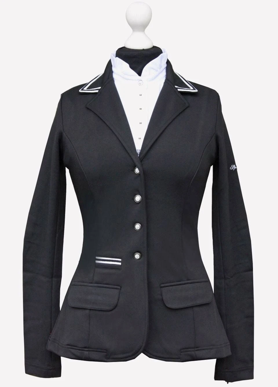 The sporty and stylish element of this showjacket is sure to make it a very popular choice! With contrasting white stripe detailing on both the collar and above the pocket, as well as logo embroidery on the sleeves, Spooks crowns on the buttons and trendy zippers on the sleeves, this jacket is packed with fashionable features!